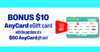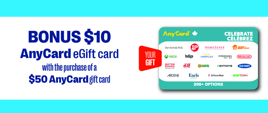Limit of 3 per customer. Offer valid in-store only at participating Jean Coutu locations April 9 - 15, 2026 or while supplies last. To qualify for this promotion, customer must purchase a $50 AnyCard gift card. Receive one (1) $10 Bonus AnyCard eGift card. To claim your Bonus $10 eGift Card(s), go to prepaidpromotions.com. Claim must be made by April 16, 2026. Bonus eGift cards are available while supplies last. Further details, terms, and conditions may be available on the website and/or on the specific gift card(s) purchased. All trademarks are property of their respective owners. The gift cards featured are not sponsors or otherwise affiliated with this company.
